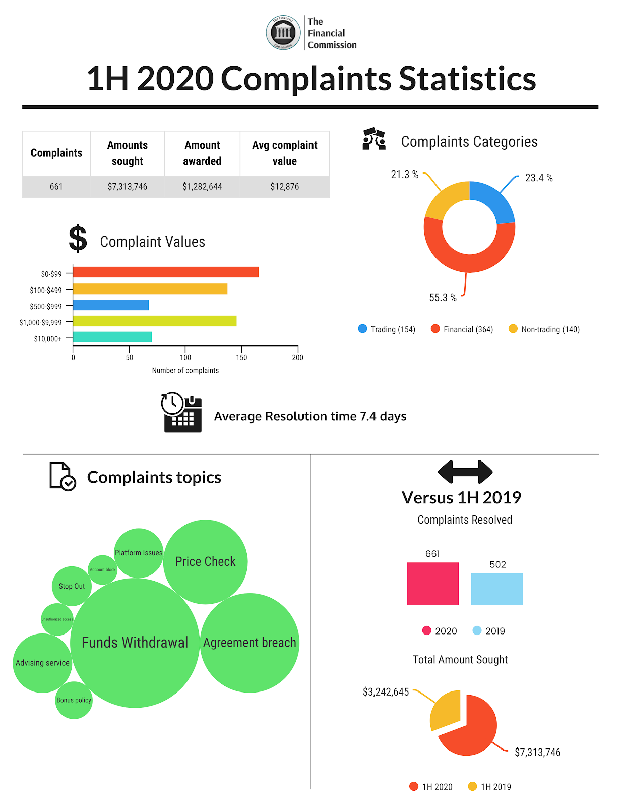 - Complaints were resolved in 7.4 days on average, which is 14% longer than 6.5 days in 2019, yet still comfortably quicker than other organizations tasked with dispute resolution in the FX markets.