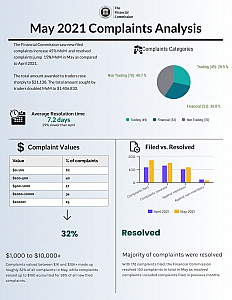June 9th 2021, The Financial Commission today announces significant increases in key metrics, including new complaints filed, amounts sought and awarded in May 2021 as part of its monthly Complaints Digest. The organization also experienced a further spike in trading related complaints while average dispute resolution times increased to 7.2 days for the month.