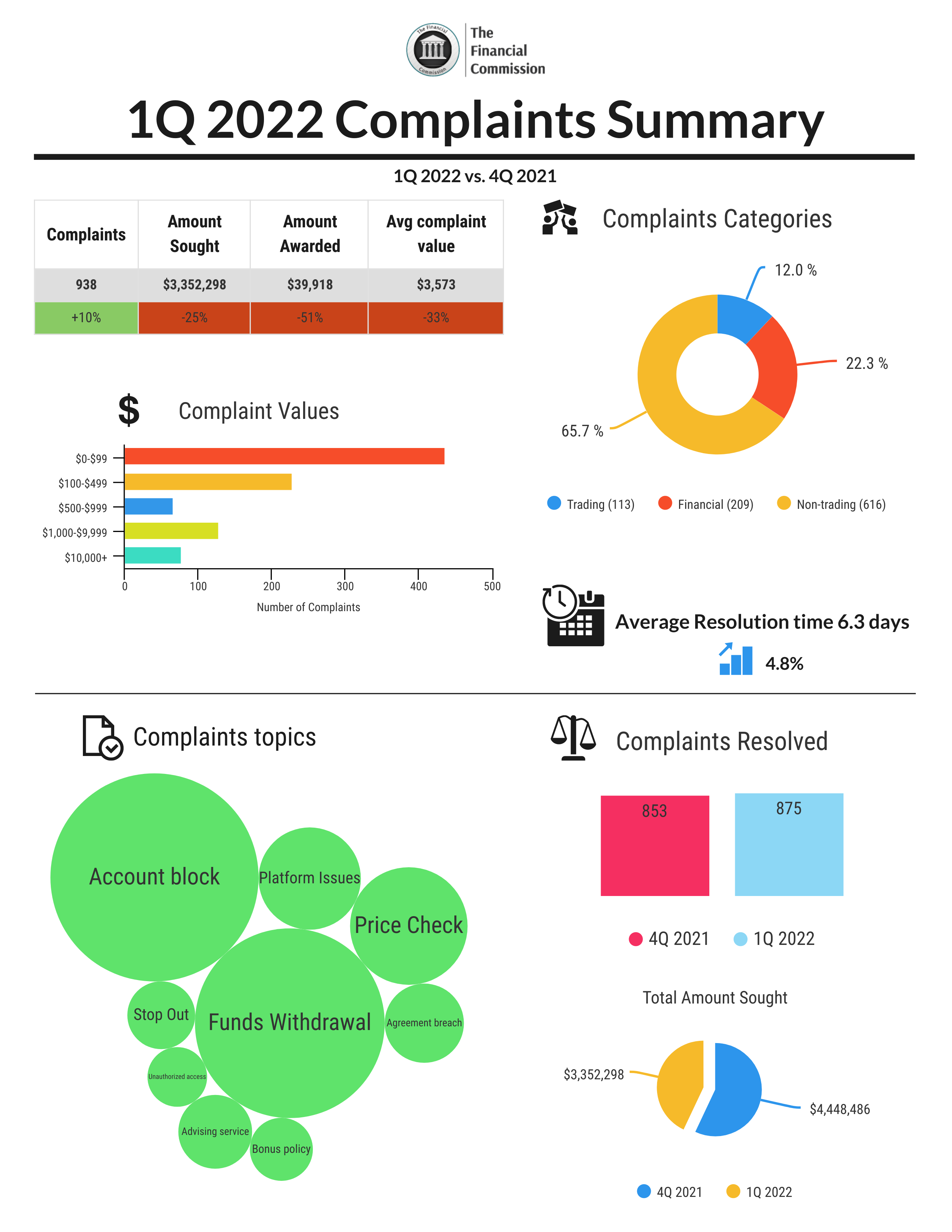 Demand for retail trading continued to impact several key metrics of the Financial Commission in the first quarter of 2022. An increase in newly filed complaints and increases in resolved complaints suggest traders are continuing to try and take advantage of market opportunities with the Dispute Resolution Committee (DRC) continuing to process a significant amount of complaints in the first quarter of the year. The DRC was able to award a smaller amount of compensation to traders than in the previous quarter while experiencing a jump in the amounts sought by traders from broker members during this time. Financial-related complaints increased by 40%, which indicates a significant rise in disputes related to funds withdrawal. At the same time, complaints listed in the most valuable category ($10K+) jumped 70% in 1Q 2022, highlighting the continued importance of the organization to investigate complaints with a significant monetary value. During the quarter, the DRC was able to resolve 3% more complaints than in the previous period with fewer complaint investigations and decisions carried over into 2Q 2022, while maintaining exceptional average resolution times, which still continue to outpace alternative EDR services.