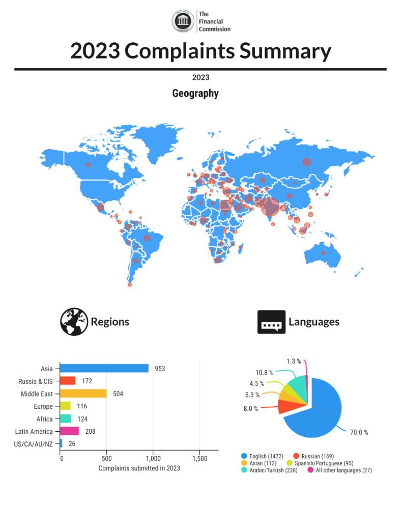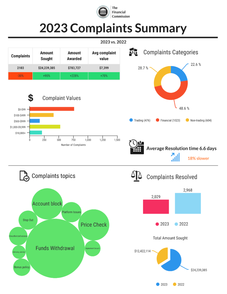 The Financial Commission today announces the results of its operations for the previous year with the publication of the 2023 Complaints Summary. The forum achieved significant growth in several key metrics, including amounts sought, awarded to traders, as well as complaints values during the year, while improvements in streamlining complaints submissions at member firms contributed to a decrease in overall complaints filed and resolved throughout the year.