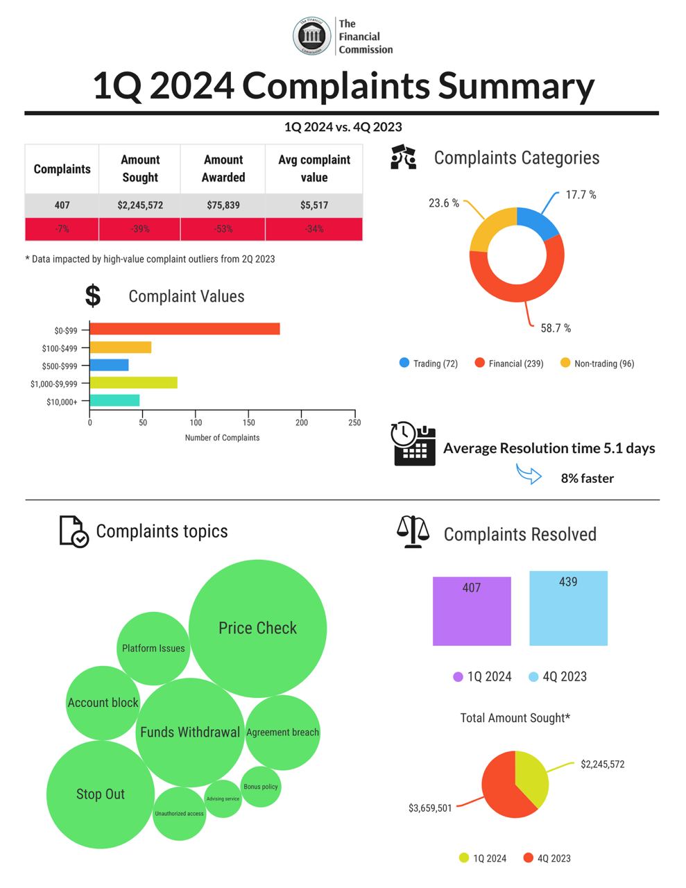 The Financial Commission, a leading independent, non-governmental self-regulatory organization and external dispute resolution (EDR) forum announces unprecedented membership growth with 7 new brokers members joining its ranks in the first quarter of 2024. In addition, the organization experienced increases in several key operational metrics, including total resolved complaints, financial-related complaints, as well as complaints against non-member brokers as part of its quarterly Complaints Digest. The organization also recorded quicker dispute resolution times, with complaints being resolved on average in 5.1 days.