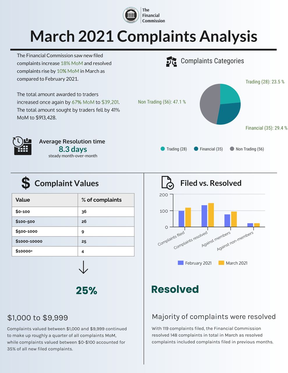 استمر الاهتمام المتجدد بتداول الأسواق العالمية في دعم الطلب على خدمات حلّ النزاعات الخارجية (EDR)، وهو ما يتجلى في نموّ العديد من المقاييس الرئيسية للهيئة المالية الشهر الماضي. وتشير الزيادة في الشكاوى المتعلقة بالتداول إلى تزايد عدد المتداولين الذين يستغلون فرص السوق ويواجهون مشاكل في تنفيذ الصفقات أو التسعير. وقد تراوحت قيمة ما يقارب 25% من إجمالي الشكاوى الجديدة المقدّمة إلى لجنة حلّ النزاعات (DRC) في مارس بين 1,000 و9,999 دولارًا أمريكيًا، مما يُبرز الأهمية المستمرة للجنة في التحقيق في الشكاوى ذات القيمة المالية الكبيرة. وخلال الشهر، تمكّنت لجنة حلّ النزاعات من تسريع وتيرة حلّ القضايا، حيث ارتفع إجمالي الشكاوى المُحلّة بنسبة 10% مقارنةً بشهر فبراير، مع الحفاظ على متوسط ​​زمن حلّ ثابت قدره 8.3 يومًا.